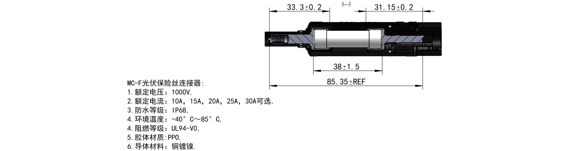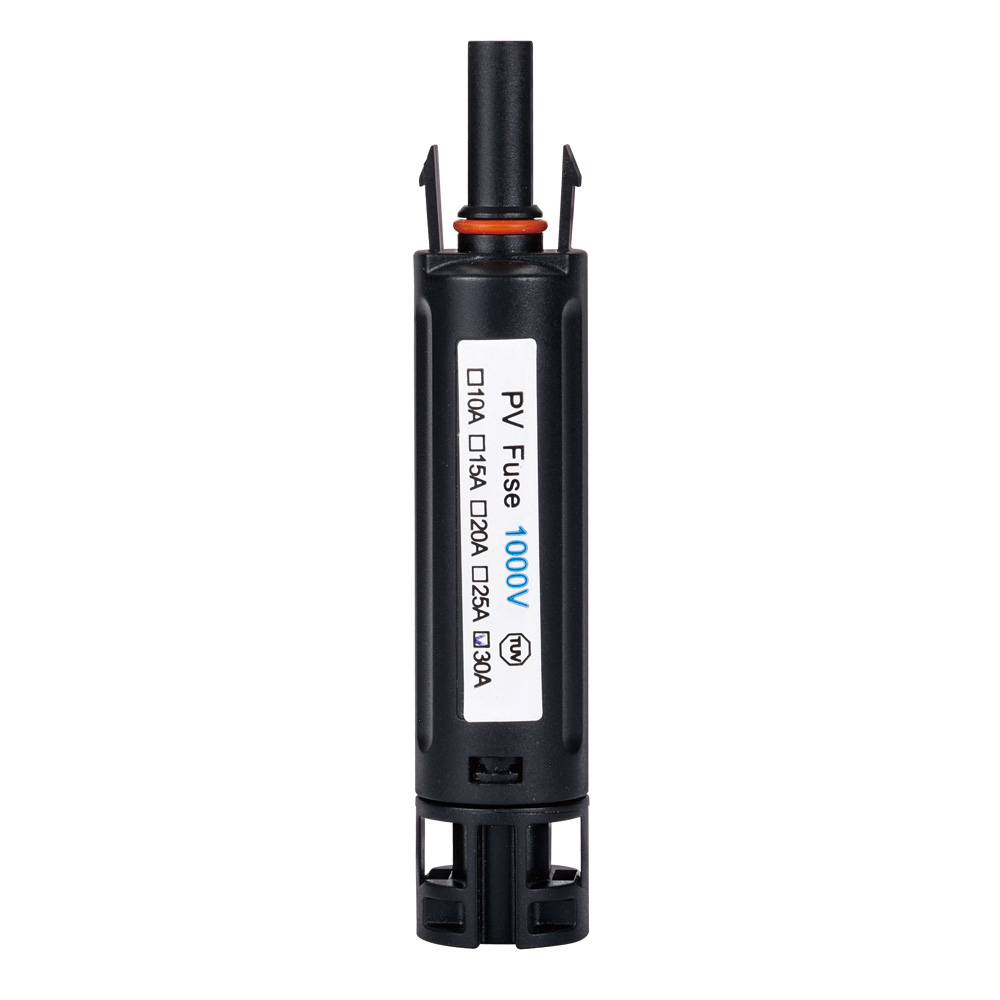 本光伏熔断连接器适用于额定电压 DC1000,额定电流 10A~30A(因不同型号而不同),额定分断能力至 20kA 的电路中,作为光伏发电器件及其它半导体设备的短路及过载保护。本连接器兼容 MC4 对接。